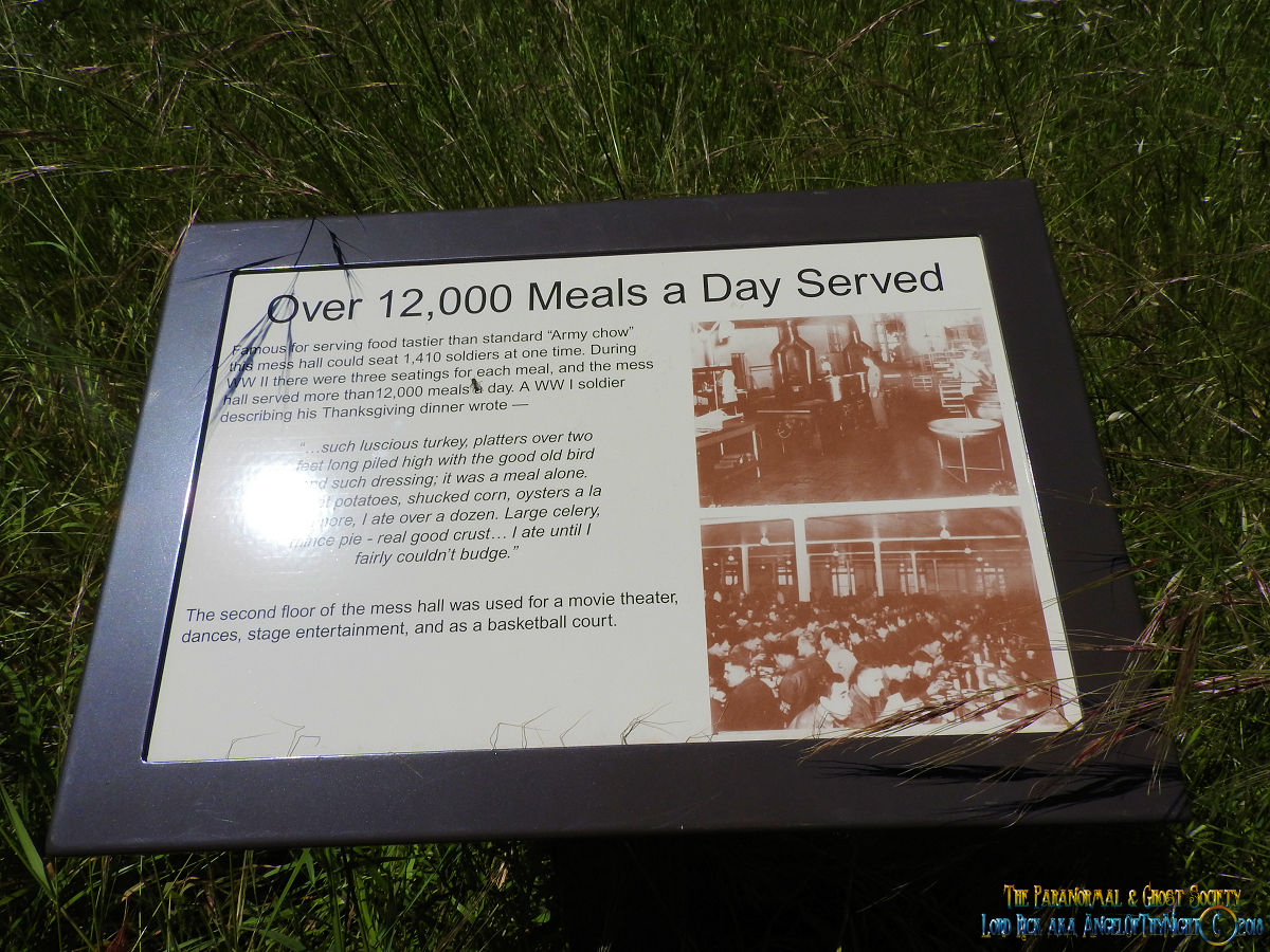 Famous for serving food tastier than standard "Army Chow" this mess hall could seat 1,410 soldiers at one time. During WWII there were three seating's for each meal, and the mess hall served more then 12,000 meals a day. The second floor of the mess hall was used for a movie theater, dances, stage entertainment and as a basketball court.