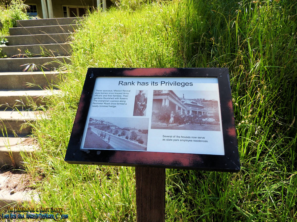 These spacious, Mission Revival style homes once housed Army officers and their families. Their gardens flourished with flowers. The overgrown Cypress along the Perimeter Road once formed a neatly trimmed hedge. Several of the houses now serve as state park employee residences.