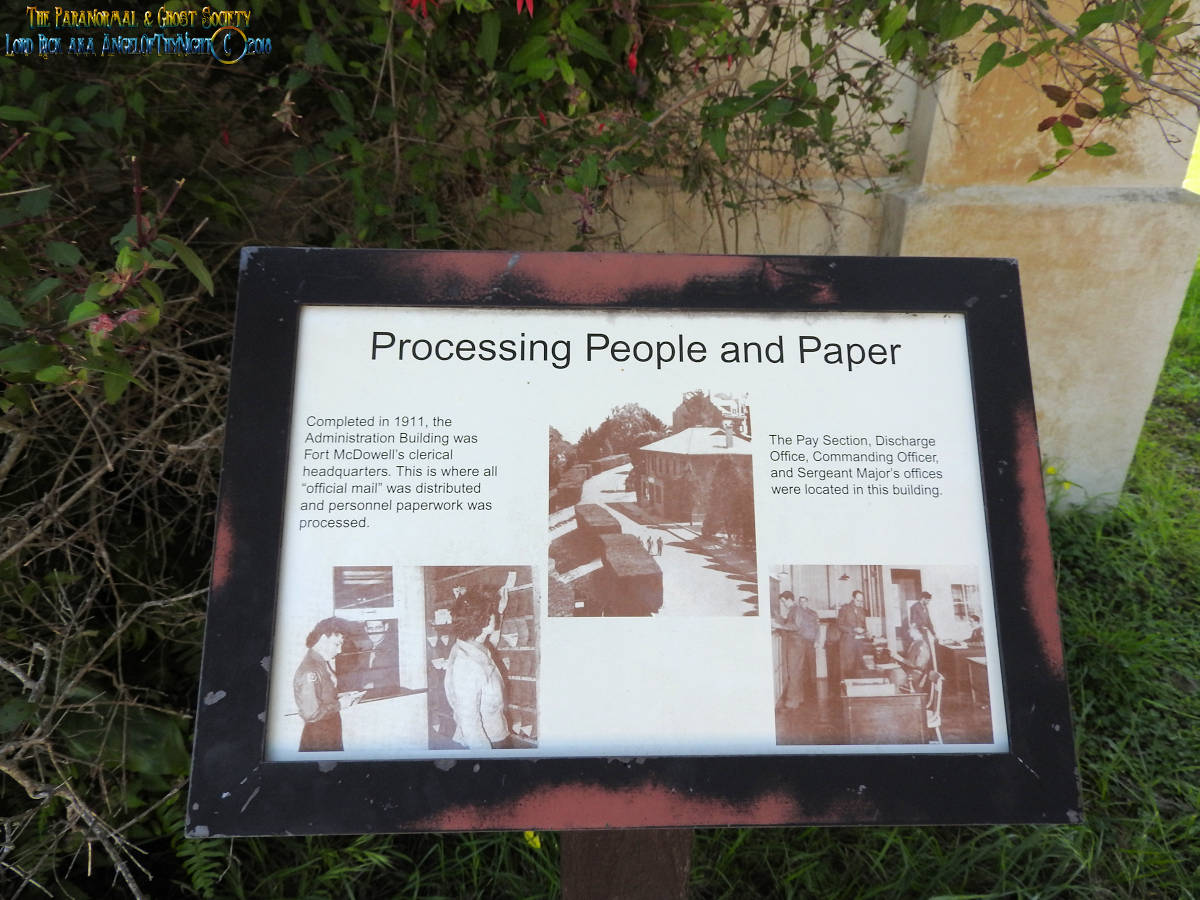 Completed in 1911, the Adminstration Building was Fort McDowell's clerical headquarters. This is where all the "official mail" was distributed and personnel paperwork was processed. The Pay Section, Discharge Office, Commanding Officer and Sergeant Major's offices were located in this building.