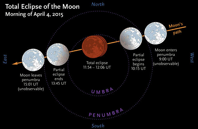 The total eclipse of April 4, 2015, is the third of four total lunar eclipses separated by approximately 6 months, a phenomenon astronomers call a "tetrad."  Such a closely-spaced succession of eclipses is a fairly rare occurrence. The complete list of dates is April 15th, 2014; Oct. 8th, 2014; April 4th, 2015; and Sept. 28th, 2015.