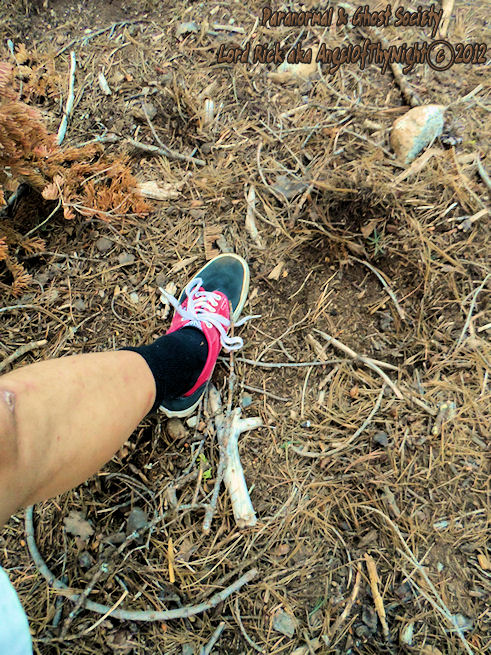 These massive tracks were found just behind our camp site which was primitive not to far from the creek. This is the same area Rascal ran off scared our first night camping here. Not far from this location up on the peak I had a sighting. That very same day we heard a massive bellowing scream behind camp. You can use my foot in comparison to the track. The ground here is very soft so whatever made it had some weight and size to it. Of course their are no toe impressions considering that the pine needles and soft dirt absorbed most of the impact of the foot. Notice in one photo Rascal and Jarrod are standing around multiple large tracks. Something came through this area maybe Bigfoot crosses up onto the peak through this primitive site and sometimes he might even come back here to find scraps left behind by other campers its truly hard to speculate on!