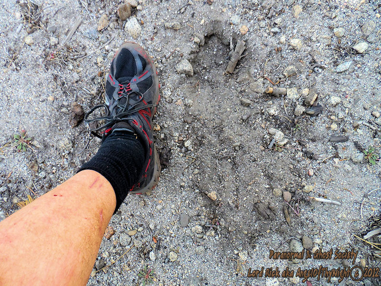 This impressions was found in an area that is extremely difficult to get to. It does not look like much as its very old perhaps as much as a year old. Nothing grows where the impression is not to far away we found similar tracks when dead ended at a cliff. Which means this creature Bigfoot could be climbing the cliffs in the sierras to get to where he has to go which wouldnt leave as many impressions but still once he were to get up or down their would be some. Consierding the location nobody has been back in here in years.