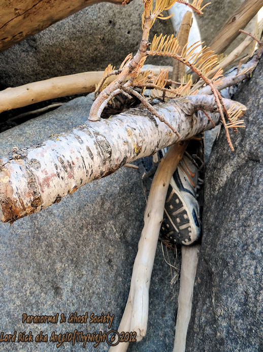 We found this show wedged in some limbs on Cole Creek. Cole Creek can become a treacherous ravine of rapids after a very harsh winter. However this year the winter was mile so the creek was rather low leaving behind sneakers, clothing and other strange finds. Its possbile that they are just lost articles then again each and every year thousands of individuals come up missing. Those could be victims of murder, drownings, lost hikers or just careless individuals.