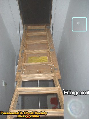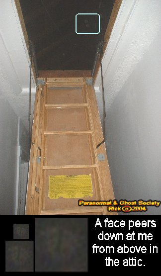 We went back up the stairs again I pulled the hatch to the attic. Attics are bad news since here in Florida you could have anything all the way from killer bees to black widows. So I used caution climbing the ladder I stepped into the attic. This probably was the most peaceful part of the house was not even uncomfortable as I shined my light down the two passages one I was able to see the road from a small little wood window with slits in it.