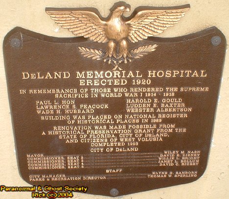 Bill Dreggors Park and Memorial Hospital has got to be one of my favorite places to visit. Maybe because Florida itself is not very hilly yet the hospital and park sit on atop of a hill when approaching it. The grounds are so beautiful at night all lit up in the front and during the day oak trees, cypresses and palms are visible. The park was named after Bill Dreggor who has been and still is an important resource for history in the DeLand Area. It was named after him to honor the living historians successes in revitalizing the community, preserving historic buildings, and educating the public about Central Florida's history. This historic site is also registered with the National Registry of Historic Places and the site contains the Sensory Butterfly Gardens which was was started by the DeLand Garden club created for the Visually and physically challenged including Braille at each exhibit. Many specially selected plants can be be sensed such as there scents, color, texture, taste, and touch. There is also a 7/16 mile loop for joggers and walkers. Also on the parks grounds is the Hawtense Conrad Elephant Fantasyland, Toyland, The Lemon Room and Freedom Playground. One can visit the Memorial hospital and take a lovely stroll sitting on one of the benches in this 7 acre park. It really is a place of serenity and peace. Back in the 90s when the Sensory Gardens were open a poem was read and many butterflies were released out into the open. Today some of the park is used by DeLand Parks and Recreation Department, Now lets talk about the Memorial Hospital which today is a museum featuring 8 exhibits. It was built in 1920 and by 1922 it was dedicated to the service men of WWI. The hospital remained in service all the way up to 1948. In 1993 it was restored and today you can see the original operating room with equipment and even a antique pharmacy display. The building behind the hospital was built for the care of the Black Community. Both hospitals on the grounds were in use till in 1952 the services were transferred to the former Deland's Naval Air Air Station which was awaiting the opening of Fish Memorial Hospital. At that time it was used by Stetson University as a fraternity house, then it was used by administrative offices for the public schools in DeLand and even a place where rooms could be rented out for a few dollars a day. Today if you walk past the hospital you will see an area dedicated to the Veterans of various wars fought in the last century such as WWI and WWII. One plaque even list the soldiers who died and were from DeLand. So there is lots of history here and like most military hospitals, frat houses and places where surgery occurs there is a always a ghost story. But from our research we discovered various transparent faces in some of the windows watching us, cold spots, orbs with faces and even the apparition of a man sitting down at the gazebo on our first investigation. So we do have some activity occurring. It is just a matter of monitoring it over time to learn a little bit more about what kinds of entities haunt the grounds. We will revisit here again many times since this place is a very important part of Deland's history. Also the fact is that we believe its very haunted as we seen many different apparitions while taking photos of the grounds at night. But also my son seen a man sitting in the gazebo next to the hospital who was he a veteran? A victim of war? We may never know! But be brave and walk with us as we looked in the dark windows of this old hospital, walked the dark trails in the park, and were not alone as the supernatural surrounded us. Below you can find a little more in depth history about the Deland Memorial Hospital Museum. © By Rick-AngelOfThyNight Daytime Night Inside (Taken From DeLand's City Site)
