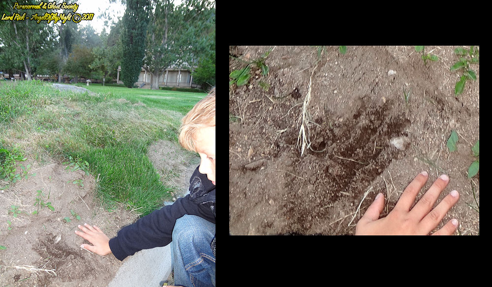 When we pondered a bit on a bench we made our way back down the dirt trail behind the mansion. This is where we found an eerie hand print right in the middle of the trail. When I observed it I thought son your messing with me so I had him put his hand next to it and sure enough it was not a match. It looked however like something clawed at the ground strangely seconds before we found it I did ask for some kind of physical sign that the Bowers are present. Maybe this was some kind of sign the imprint was fresh and intact despite the amount of visitors this park recieves.