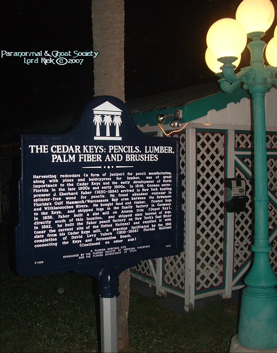 When some people hear about Cedar Key they think to themselves paradise....a fishing village...a romantic getaway...then some of us who are history buffs and paranormal investigators think to ourselves a deeper darker history which often the islanders forget about. The old saying to the island is time stands still and life slows down in Cedar Key. Not only is the island very old so is the bay surrounding it. Often known as Waccasassa Bay it dates back from the Pre-Columbian Period to early pioneers to the Civil War to a Timber Harvesting area. Those people around the bay built homesteads then hunted deer, turkey and bear. They would cut down timber...hunt cows...and face the harsh conditions that this island was battered with by storms. The hammock trees were used in providing development of Cedar Key which would provide cedar for the pencil factories...and palms for the fiber factory. Today one that would hike along the bay could still find the boilers once used in the production of brushes and brooms made from sable palm fibers on the preserve outside of Cedar Key. Cedar Key really is not one set island but rather a series of little ones...for example one called Salt Island which is named for the salt Kettles found here which were used to extract the salt from salt water during the Civil War. Many Indian artifacts and pioneer sites can be found on the preserve south of Cedar Key. Now that is just the preserve surrounding the island so lets get into the more deeper island history. Cedar Key was settled in the early 1840s by an Augustus Steel and by 1861 it was technically the largest city in Florida. It was bustling because of the Cross Railroad which ran from the port to the east coast in Fernandina. That railroad could carry turpentine, cotton, seafood, lumber and passengers from the Gulf Coast To the Atlantic Coast. If you remember David Yulee's Sugar Mill we investigated he also was the railroad owner. A very wealthy tycoon and sugar mill owner. Salt was a key commodity in the 1800s and this area. The salt would be collected during the Civil War for the Confederacy from the sea water in kettles and boilers surrounding Cedar Key. In 1862 however a Federal force had attacked the salt operations by sea and captured Cedar Key. The Kettles and Boilers were demolished to deprive the Confederates of needed supplies. I was told during its demolishing the city was burned down I am guessing people died. South of Cedar Key is a town called Yankee Town perhaps this was called this due to the Union Forces in the area. When the war had ended Cedar Key actually grew in sized and became one of the largest ports in all of Florida as it became a center for ship building, fishing, and timber. In 1896 a terrible hurricane struck the island destroying most of the town only leave a small fraction behind and that fraction is what we investigated mainly. They say Cedar Key is a lot like Keywest 50 years ago today being a small resort and fishing town. It is one of the oldest ports in the state and the site of one of the first railroads in FL. Today times have changed its a fairly quiet place full of sea captains and fishermen who live off the sea. Many artist and writers come to find this place inspirational for their work. The town is full of historic streets with galleries, shops, exotic sea food restaurants and some barrier islands that I heard you can walk to when the tide is low. Downtown right on the lawn of residents Midden Mounds can be found. I did not see this during my walk in downtown Cedar Key then again I did not want to disturb the locals by traversing on their front lawn. One of the mounds in 1883 was discovered by an S.T. Walker who was an archaeologist from Clearwater. He dug about 12 feet out of it and found pottery. Based on the different levels were various pottery. Like the bottom few feet had thick very course and thick pottery. That was tempered with gravel and sand. The next four feet had thin pottery with rims turned outward. Then higher for about three feet up was some check-stamped pottery found here. Finally the next two feet after that had little pottery and the top three feet of the mound had pottery with handles and ears. It was decorated with zigzag lines, dots and curves and some were painted. Walker assessed that the pottery was from four different cultural periods from about 299 B.C. Until 1200 A.D. The sand dune beneath that mound was a million years old. Somehow I missed it or passed these mounds but then again I probably looked at it just did not think nothing of it cause basically what it looks like today is just a small hill with a house on it lol. There is a few areas where there are shell mounds another one is near the Cedar Key Lions Club so we know the Native American people were the first on the island. But see today the island is not known for its history its also known for its amazing bird watching. They have sanctuaries for birds here throughout the barrier islands. Birds like the white pelicans, herons, white ibis, cormorants, anhingas, egrets,roseate spoonbill, and even the bald eagle. The nature around the island varies just as the habitats do from salt marshes to Indian shell mounds. If you want to get technical there is 12 barrier islands surrounding Cedar Key. For example Sea Horse Key the outermost island was used as a military hospital and served as a detention camp that captured native Americans during the second Seminole war in 1835. A lighthouse sits on that island and was built in 1851 then abandoned in 1952. Now the lighthouse serves as a center for marine research and environmental education. The island is what it is a giant sand dune that is 52 feet in height perhaps even the highest point on the states west coastline. Then we have another island that is up to 20 feet above sea level covered in live oaks, laurel oaks, cabbage palms and red baby. There is also verdant under story, saw palmettos which I hate lol, cherry laurels, yaupons, wild ol