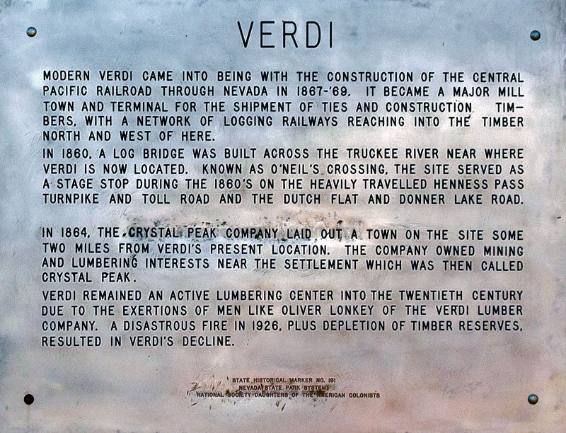 ![]() ![]() ![]() Just NW of the city of Reno practically on the Nevada/California border is the small scenic town of Verdi originally known as O'Neils Crossing for the man who built a log bridge here spanning over the Truckee River in the year of 1860. By 1867 The Crystal Peak Toll Bridge and Road Company was formed by a J.P. Foulks and M.J. Smith. Prior to this the route was discovered by Caleb Greenwood in 1844 which provided an alternate route to travel through the Truckee River Canyon which traversed through the town of Boca California along the Boca Reservoir, Stampede Reservoir, Truckee, Henness Pass Road and Highway 89 today. No less this route brought in many pioneers to the region while some came here to mine others came here to work on the railroad. Therefore Crystal Peak was established to serve those who sought trade within Dog Valley. When the Central Pacific Railroad was completed the town vanished supposedly today if you look hard enough you can still find a few foundations something will eventually do research on. The town also had a post office from 1864 to about 1869 which is about how long the settlement of Crystal Peak lasted for. When the settlement was established it was merely a major milling town as a matter in fact it served as the terminus for receiving railroad ties so that the CPRR could be built through here. Their was quite a few short lines leading to various lumber camps to the north and west of here. The lumberers would cut the trees down then they would load them up via railcar shipping them to Crystal Peak where they could be cut down to be used for ties for the railroad. Back before it really grew into a major town it was merely a stage stop for those seeking supplies or to even trade. Some of them settlers came down from Dutch Flat, Iowa Hill and Truckee as well as Donner Lake via stagecoach. By 1864 the town was platted instead of folks passing through some were actually settling here as a matter in fact today's town of Verdi is only two miles from the original town site of Crystal Peak was located. I believe they called it Crystal Peak because the summit does overshadow the entire town site including this cemetery which is one of the last remaining remnants of the original town. The Crystal Peak Company actually bought up allot of land out here to be used from timbering and mining. When Crystal Peak diminished the town of Verdi flourished and grew thanks to men like Oliver Lonkey of the Verdi Lumber Company who for many years lumbered the mountains surrounding the town which in turn could be shipped from here via railroad. Sadly a great fire in 1926 burned many of the forest surrounding the town and such companies also depleted most of it thus leaving very little behind causing the town to go into decline. This does not including all the earthquakes which have occurred here over the years as a matter in fact from Feb. 2008 to June of 2008 an earthquake swarm began causing approximately 5000 quakes. So the area is prone to disaster between fires and tremors as it has been for many years probably even prior to the first white men arriving here. Verdi was named after Giuseppe Verdi by a Charles Crocker also the founder of the Central Pacific Railroad he is also buried at The Sacramento Old City Cemetery today. Back in the day they could not decide what to name the town so they put a few slips of papers in a hat then pulled the name of the Italian Opera Composer in 1868. The name is pronounced as Vur-dye. In Spanish the name means green and although this is a very green mountainous valley most people misinterpret the name or even how it was founded. If you drive around Verdi you can see some history surrounding the town for example old wagons and some historic structures line Main Street. In a sense Crystal Peak and Verdi blended into one town its not as bustling as it was in the 1800's though. Today allot of wealthy people own homes here and why wouldn't they the scenery is gorgeous it is also a very quiet community. Their are some perks by living in a town like this for example its home to the Sasquatch Tavern and Boomtown Fun Center both of where can be found integrated into this addition on our website. I always try to keep our website fun, friend and family orientated so that all of you can be a part of what it is were trying to do here. The Cemetery just sits on the outskirts of town the first recorded burial that transpired here was that of a 15 year old girl named Rebecca M. Dunn on January 15, 1864. The second burial then took place in 1867 a few years later. We are not sure why the cemetery was established at the location it was erected but I read that the Native American burial ground was here first then others begin to bury there loved ones next to it. Sadly today nobody knows where the ancient burial ground is since all the graves are unmarked. Also within the southwest corner of the cemetery is an open area which was said to be where the Chinese Railroad workers were buried who worked on the Central Pacific Railroad. Its hard to know for sure since most of the wooden grave markers are gone or many graves were simply unmarked. The Chinese came to the region to do one thing and that was seek work for the railroad. Although it did pay they were paid very little and allot of times these men died on the railroad. The railroad which goes through the center of town is a reminder of these emigrants hard labor. From the 1800's till about WWII the cemetery remained neglected perhaps even forgotten especially during the depression. Many of the graves were weathered, elements had destroyed most of them and it was very overgrown. Their was no organization that even controlled or owned it. By 1949 a group of locals decided to restore the cemetery by grading it to clear the land then installed a new fence around the perimeter. In 1955 other interested parties began to the task of forming and organization to operate the cemetery. The cemetery at the time