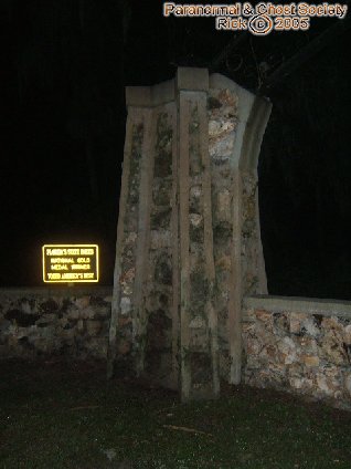 In the early 1830s the US told the Seminoles that they had to move to a reservation in Oklahoma which most of them did without a problem. The ones that stayed behind signed a treaty stating that they would move if they were given a year to make preparations. These Seminoles were very powerful composed of chiefs and many warriors. They had no intentions on leaving they just were buying time to gather up enough Seminoles to fight for their lands and for the Seminole People. In December 1835 Major Francis L. Dade and his 108 troops left Fort Brooke (Present day Tampa Bay) to help with the reinforcement of Fort King (Present Day Ocala). The trip was roughly 100 miles so the men started their march before Christmas which means they left around December 23rd 2005. The men more then halfway their marched for 5 days in peace they did not see any Seminole Indians so no flankers were set off by Dade cause the military road was quiet during their march northward. The Seminoles were aware of this army that was cold, tired and marching on the military road. They were watching for roughly 5 days quietly hiding in the scrub pines and palmettos they were waiting for the right moment. If anybody has been to the Florida woods some areas are very similar to a jungle like fauna so truthfully anybody or anything can hide in the woods without being seen. Since the Seminoles were experts in the woods they were able to camouflage themselves well. On the morning of December 28th 1835 Major Dade said "Have a good heart; our difficulties and dangers are over now, and as soon as we arrive at Fort King you'll have three days to rest and keep Christmas Gaily" to his men to encourage them. Little did he know that only 8 hours later those would be his last spoken words. The 108 men were pass through a high hammock of oaks, pines, cabbage palms and saw palmetto when they heard a shot. They were not able to get to their ammunition boxes because their over coats covered them due to it being a cold day. All of sudden they were in the middle of an ambush. At least half of the men were either killed or wounded one of those men was Dade. The Indians then retreated which gave some of the men a chance to construct a breastwork of pine logs to be used as a small fortification. Then moments later a second onslaught took place the pine breastwork was only knee high and was not completed by the men. At that point in time nearly all the soldiers were dead. Two men John Thomas and Joseph Sprague escaped and made it back to Tampa while the fighting was occurring. After everybody was thought to be dead the Seminoles left the area. Two more men named Ransom Clark and Edward Decourcey pretended to be dead on the battlefield. Both men also headed back towards Tampa with Luis Pacheco a black guide. On the way Decourcey was killed by the Indian. So in total only 3 soldiers lived to tell the tale and only 3 Seminoles were killed out of 400 to 1000 Indians speculated by the survivors. Chief Alligator known as Hallpatter stated their were only 180 braves some slaves some warriors of the Seminole Nation. Also responsible for the massacre was Chief Mico Onapa known as Micanopy and Chief Jumper. I am pretty sure the Seminoles let a couple men escape purposely to warn the US that the Seminoles would not go down without a fight. This massacre caused wraith within the US government and the Second Seminole war had begun. Seven weeks later the bodies from the massacre were finally found rotten and unburied. It took the men 7 weeks to arrive here cause they had to gather a new army. The men were buried on the battlefield temporarily till the bodies were moved in 1842 to a National Cemetery in St. Augustine where today three stone pyramids resides over a mass grave. It really is a sad place when you think about it. I mean these men did not even get to celebrate Christmas let alone even have a chance to fight back. Most were shot and killed instantly. The Indians were able to kill the men and quickly disappear into the terrain which was favorable to them but not proper military warfare for the US soldiers. When war was declared on the Seminoles their were at least 40,000 Seminoles that were able to elude capture and because of this that war lasted around 7 years. In 1905 a Congressman named Stephen Sparkman asked for copies of files related to the Dade Massacre to be sent to him. He proposed a bill to save the site but it was not passed. Then later on Senator Duncan Fletcher continued to gather more documents with the encouragement of Superintendent of West point named General Douglas MacArthur. By 1921 the state legislature funded the preservation of the battle site to be used as a memorial. The arch made out of stone and wood was built in 1922 at the entrance to this 80 acre area. Today if you were to visit you would see a part of the Fort King Military road still preserved or at least a section of it. Another section of it lies near Fort Cooper where we also investigated. Along the military road are a few memorials of the men who had fallen here. Their is a replica of the pine breastwork or rather log barricade that soldiers used in their defense. The lodge which was built in 1955 was named Tustenuggee meaning war chief. Their is also a reenactment battle mound, meeting hall, picnic shelters, a playground and hiking trail. The area was preserved to look very old as their are stone bridges in various parts of the battlefield. Their is even a giant oak tree near the battlefield which is supposed to be one of the largest on the gulf coast of Florida. The battlefield was placed on the National Register Of Historic Places in 1972. Every year on December 28th the battle is reenacted or should we say the massacre. Although this massacre had happened here today the place is rather peaceful but its also quite haunted and of course like most places you see on our site we are the first group to do an investigation here. I mean putting yourself in the soldiers sh