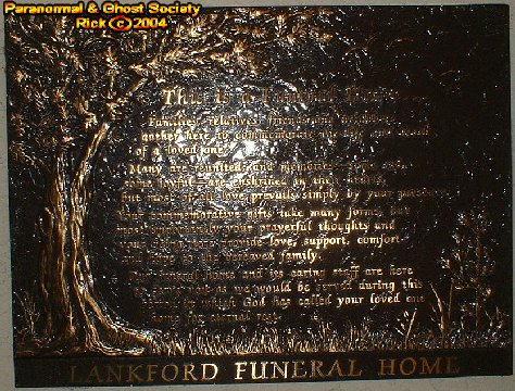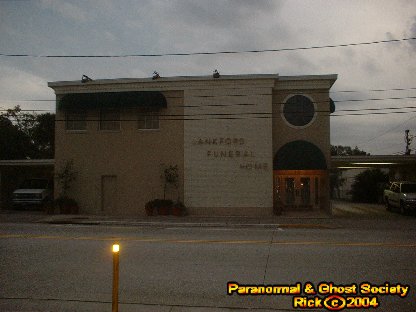 The Lankford Funeral Home & Crematory I believe was erected in 1950 and is one of the oldest ones in DeLand besides its sister one that is in Orange City. When I first arrived here in Florida I would spend countless nights walking past it and it hit me quite quickly that something here was not right whether it was those feelings of being watched or rather uncomfortable feelings of a presence watching me. The funeral home serves most of DeLand and residents in the area and at times rather then it looking like funerals occur here it looks more like an office building. Though the oval window, flower arrangements and double carports give it away. I try not to do to many funeral homes out of respect but because it is a fact that just because there is a cadaver there does not mean that the spirit comes attached to it. However out of the many funeral homes I have walked past again this one really is intimidating. The home is owned by the Lankford family and its owner formed the independent funeral directors organization in 1992. He died in March of 2000 however one of the other Lankford's and its family operate it. Including one of them who has been doing embalming for 19 years. The crematory sits back behind the funeral home itself and that perhaps is a very eerie area. There is just a constant cold feeling back in here perhaps that is why in the after-hours nobody is ever around the funeral home maybe the family themselves is a little spooked. I will return to the home to capture some of the ghost of Lankford however for now please feel free to enjoy this interesting little place. I have worked with it alot and any given night I visit it picking up my mail and often I will just stare back into the windows as the ghost of Lankford stare back at me.