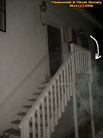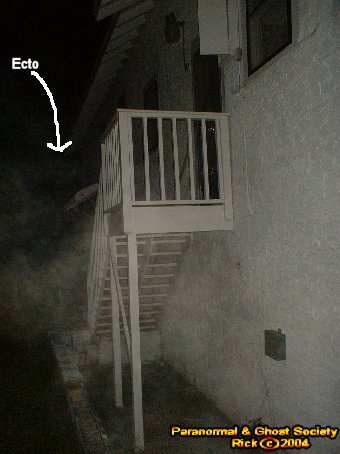 Eventually I took a dirt road which leads behind the house and dips down. The full moon illuminated my way but still it was quite dark so my eyes did have to adjust. I noticed my first time around the lights were quite dim inside the club. When I turned the corner to go to the back of this giant house Ectoplasm caught my camera and my eyes on one of the stairwells leading into the club.