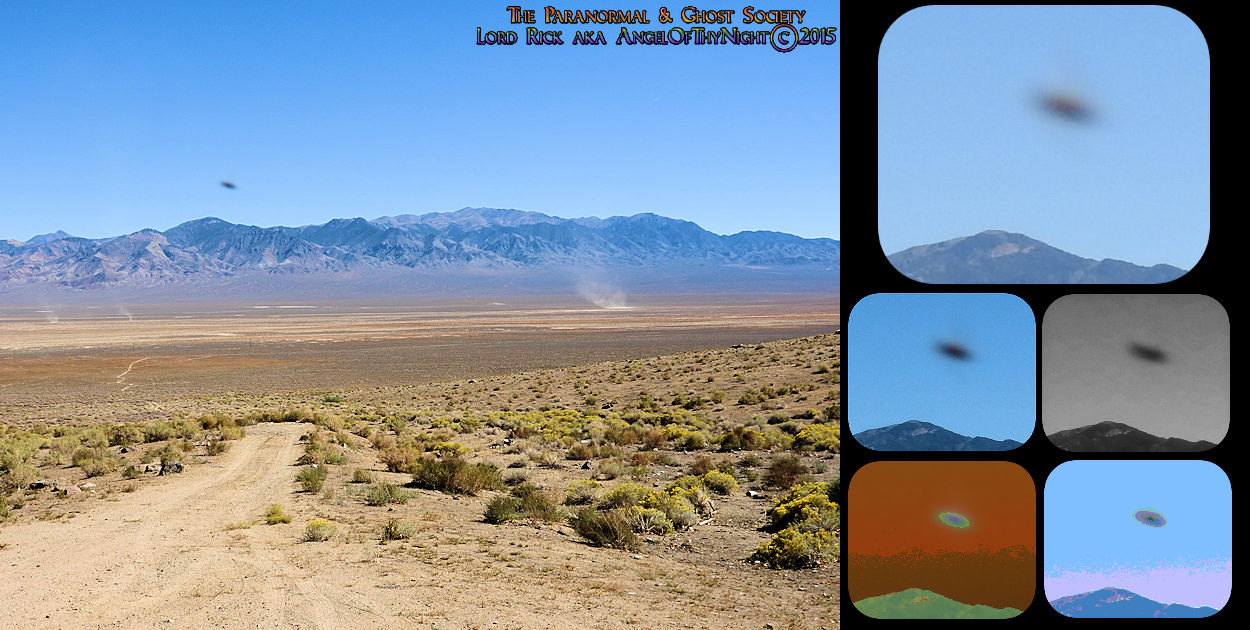 I captured this UFO hovering right over the valley floor to the right of it is a massive dust devil. I took the photo from a place above the valley known as Willow aka Mud Springs. Within Dixie Valley are quite a few roads that go up into canyons or at the base of the Stillwater and Clan Alpine Ranges. Therefore allot of those roads lead to springs, mines and even sites where old homesteads once stood. In this case I just had gotten done hiking around Willow Springs was getting ready to pack up the jeep take a few scenic photos of the valley and pow this UFO streaks across the valley. People do not realize that this valley is now owned by the US Navy its kind of in a way like an area 51 it just does not get all the hype that Groom Lake gets. A UFO like this could land in the desert and probably very few are going to see it. The object I photographed is saucer shaped their is some distortion afterall it is moving at a high rate of speed.