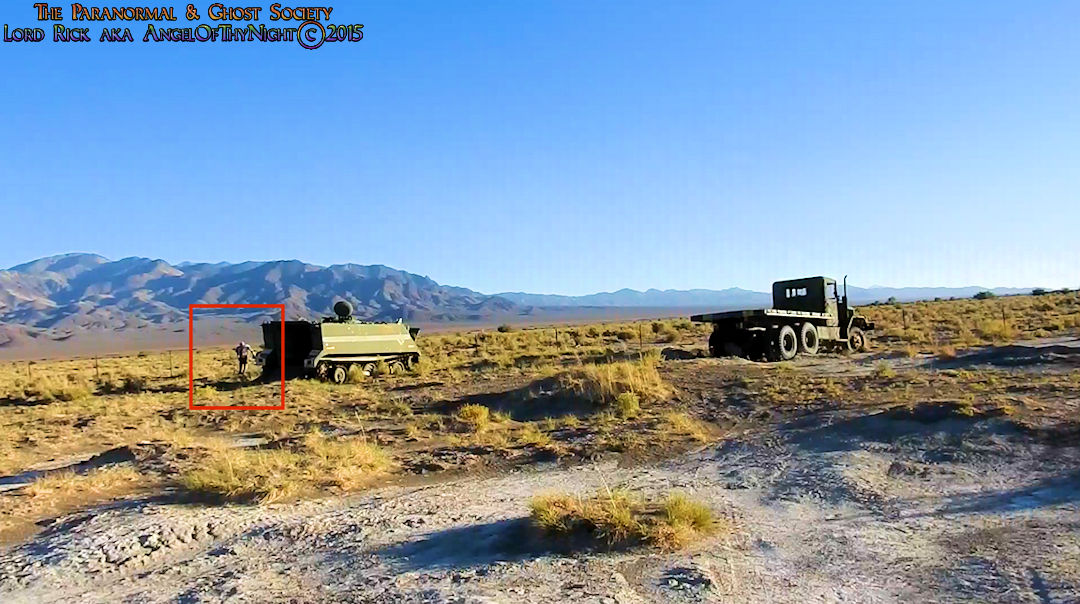 The last area id pull off at was this location about 300' off the road which had a military jeep residing between two armored vehicles. Between the one armored vehicle and the jeep we observed something very strange. At first I thought it was a tree it was far away and you get some stumps that resemble a person standing there,. I was very hesitant on going out to the area out of safety for my kids. Although I am armed numerous ways I did not know if this was a person, tree or something else.