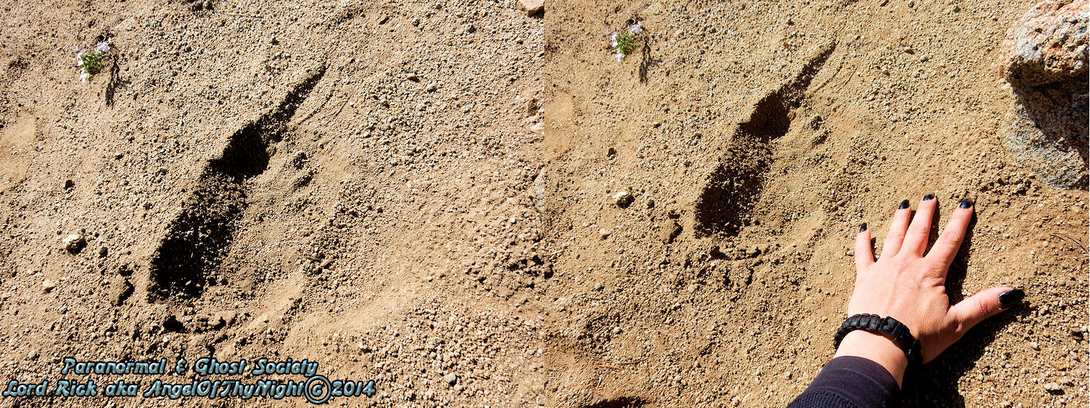 This very wide track may have came from a juvenile Bigfoot. It was a lone track which really was odd because why weren't their others following it after? Its not a huge track however study it and you will see that their are four toe impressions or divots. Which means what made it was barefoot and not its not a bear their was no claw marks nor was their a heel paw impression. I believe the track was veering off towards a steep edge to a hidden pond we found in a very thick part of the ElDorado Forest which has allot of foliage and large rocks. This creature may have made the track then quickly as we were coming down here to check out the area made its way down to the area below where it could seek shelter at so we could not see it. It was very fresh so fresh that we missed what made this by minutes maybe seconds. My son and Andy found the track as I stayed behind to photograph some wildlife and scenery that is when they called me over to examine it.