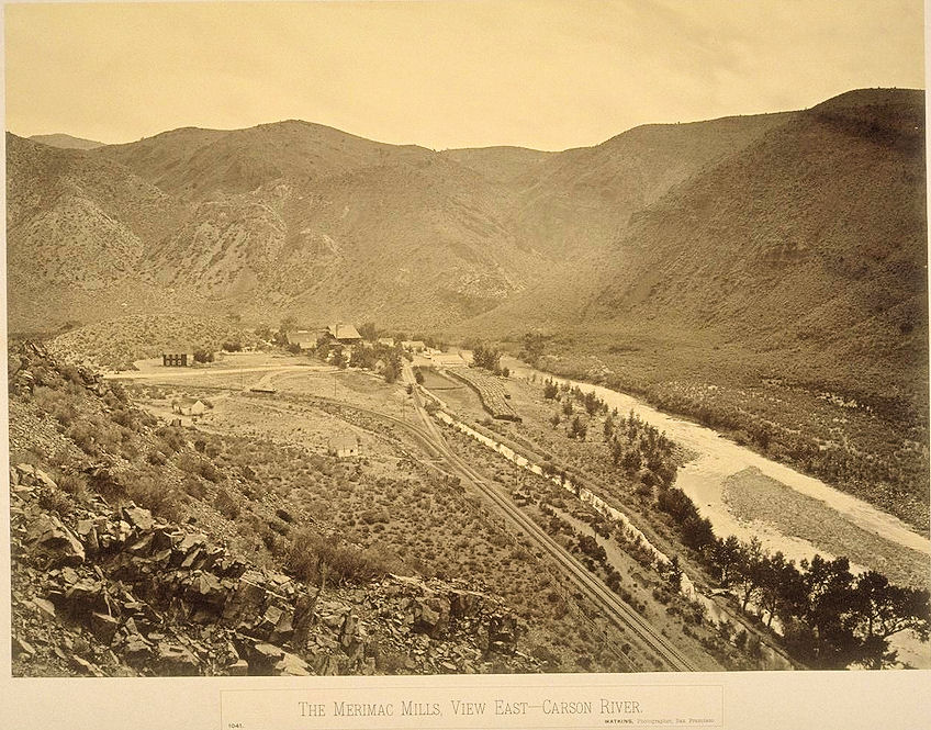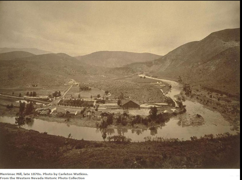 The Merrimac is at about the 3 mile mark almost as you enter the Carson River Canyon not much remains but a concrete wall on the otherside of the river,  foundations and allot of broken remnants like glass from the past. If you look at the first photo to the right and compare it with other photos in our galleries besides this one that show you how much the landscape has changed. For example the flooded area in the first photo where the one bends to the left then began's to head around the mill today is full of woods and waterfalls. Back then this entire valley below was cleared by trees because you had the Merrimac, Blue Canyon Mill/Yerington Smelter side by side from eachother. Therefore the valley was much more wide open so that the mills, complexes, railroad and equipment could be brought on in this area. The original mill was built in 1861 as you can see it contained quite a few on site structures. Most of the workers would take the train out of here and go back home after there shift while others may have had tents within the canyon or even housing possibly.