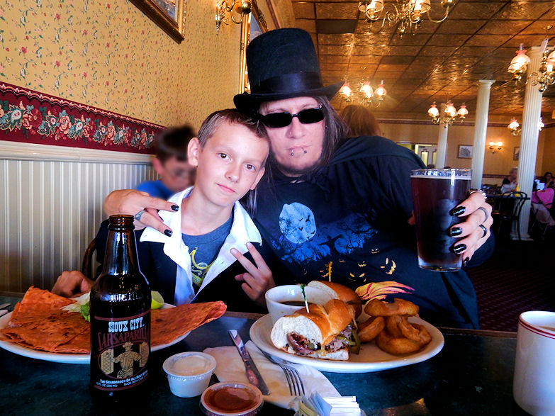 We had a nice lunch Tammy ordered Chicken Fingers, Jarrod a quesadilla and me a Philly cheese steak with homemade onion rings with dipping au jus sauce. I ordered a suicide pale ale and watched the Zombie Run from the big glass windows. They were letting runners out of these giant shipping crates it was pretty cool. Actually I did not feel so bad wearing costumes downtown considering how many others were to so I blended in of course the curator at the school probably thought I was nuts she seen in me in about 7 costumes probably thought this guy is whacked out haha.