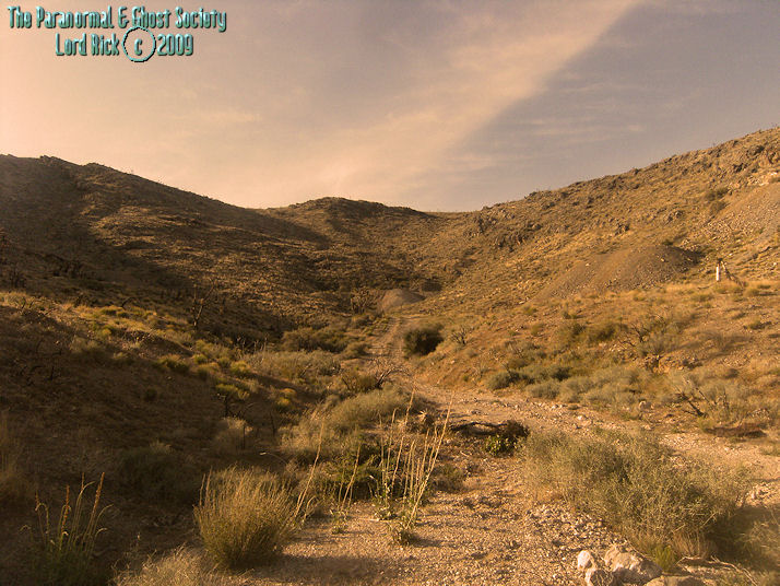 I made a special section for the mining district because during our hike we encountered so many mines but this district was more like a camp just outside of the main semi ghost town of Goodsprings. At one time they had a railroad that led back into town where minerals could be processed at the mill then exported. The entire mining district in my opinion is A. Creepy B. Full Of Paranormal Activity C. Mines & Foundations. Along the hike about 5 miles beyond the town is a series of dirt roads some lead to mines while others are just vast wildnerness and canyons. More interesting then so is the fact that I spent a good amount of time noticing a very notable landmark known as Mt. Potosi the same mountain where a TWA flight carrying Carole Lombard had crashed killing this celebrity. The mining district still shows signs that at one time stone cabins were built in the canyon and the old train tracks had been removed but the path where it ran still remains. Most of the mines are fairly small but one mine is sealed with iron perhaps this was the keystone mine which caused the town of Goodsprings at one time to boom drastically. Often adventurers will take their gear out here and camp. I seen it done as I watched from a ridge two sets of cars slowly taking the old mining road. Many types of minerals were mined here gold, silver, zinc, lead, ore, cobolt, platinum and copper. The minerals were so rich here that the population in 1915 was higher then Las Vegas reacing over a 1000 residents to this area. The mining district is in a scenic location surrounded by many mountains of course being shadowed by Mt. Petosi which is a very ancient site and place of various lead mines that sparked Vegas growth. You would expect the mines in this district to be older then what it seems but many of them were mined in the earlier 1900s unlike the much older Yellow Pine Mining District which sits fairly close to the town of Goodsprings. Here is what I can tell you about this mining district based on my experiences and what I seen. Their is a few shafts in the area that are holes leading to places our team could not get to. However for the most part we covered many mines and tunnels within the canyon. Across the valley you could see possibly another mine off in the distance. Their is so much to see and explore here. As far as paranormal experiences here the activity is heightened not sure as to why just yet. I am almost bold enough to say that I had what I believe might be some alien activity within this location. There is something that seems to follow you around often it looks like a dark shadow others reported seeing something that looks like an angel or alien like being. One both investigations individuals who volunteered for us described this. Their is an odd mist that moves fast within the district....female screams are heard probably ghostly.....black shadows move around often....and there are strange balls of lights that travel sometimes certain patterns like UFOs perhaps smaller ones. I believe I was lucky enough to capture one during my visit to the burnt down Yellow Pine Mill which radiated various colors of light. Speaking of UFOs at one point I was paralyzed in the Copper Mine almost which runs under the same hill Karrie scene this being standing on in investigation 1 of the area. I can only speculate all of these occurrences to be paranormal phenomena of some kind. I cannot say they are ghostly, alien or demonic I can just tell you based on collaborations from team members and myself. Please refer to our Goodsprings history read up to understand the connection of the district to the town. The district is so secluded that Goodsprings is not visible from here at night. The area was Anasazi and pauite territory as at one time springs graced this location like an oasis. But lets not forget that the Anasazi did mysteriously vanish and every place I visit where they once thrived at just gets stranger. One thing I can tell the public is that you always feel watched......and its so spooky that even the cops refuse to come back in here even with 4 wheel drive and SUV's thus getting stuck here, stranded or even hurt might be a good enough reason to stay very far away from this place. There is no luxury back in these hills its dark and a very historic location. My first visit to the area was an evening tour we got stranded with a flat and stuck so I never seen much of the mine district till my second adventure. But from my first trip to the area I felt it the second time here I seen it! The locals call this place Gods Country untouched by man except for its mines the world in this valley and its canyons is more then just scenic. It holds many secrets much like most mining districts in NV for example El Dorado canyon the place where serial killings took place all over the greed of man. I am sure athough records do not indicate that some wrongdoings took place in this district there are no doubt ghost of the past. Before you read my reports on our Goodsprings page at www.paranormalghostsociety.org/Goodsprings.htm .....and on this page below is an update from one of the volunteers who journeyed with us on our second trip here. His name is Rich he is an avid hiker in the southern NV area and an airline pilot. I had many problems at the time with a woman named Brenna whom I dated therefore I could not make a third trip here at that time or did not pursue one. Ever since visiting this place she seemed to become very hollow not sure out of fear or if something evil got inside of her. I watched her mental health deteriorate including a few weeks later her talking demonic in nature. I did not get to go with Rich as he went alone took a friends truck out here perhaps curiosity or maybe defiance towards whatever it was that taunted him. I have hidden his email address for protection and respect. You will see in his letter comparisons of what occurred with us and his visit later to the area. I would post it in the Godsland Co
