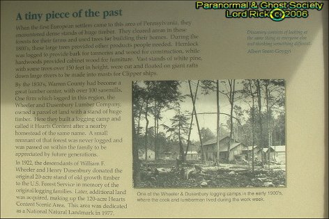 The Heart's Content area began around the 1800's when a 20 acre parcel of land was protecting from logging by the Wheeler and Dusenbury Lumber Company. This parcel of original forest was known as the Old Growth Forest or Virgin Timber and was donated to the Forest Service in 1922. In 1934 the Old Growth and 102 acres of land surrounding it was designated as a "Scenic Area" by the chief of Forest Service. The civilian Conservation Corps built pavilions and a campground in 1936. So the area here is quite old and established what is known as part of the Allegheny National Forest. The old growth forest was made of of white pines, American Beech, witch hazel, and Eastern Hemlock. Some of those are 300- 400 years of age. However many trees in the area are newer considering the area has not been logged in decades the forest is starting to come back here. White pine was a huge industry with over 100 saw mills in Warren and surrounding areas. I noticed from the trailhead board there was alot of history showing photos of what appeared to be a ghost town at one time in the Hearts Content area. There was houses, a mill, and other structures. Along the trails here you will see various historical sites one of them is a memorial dedicated to the Wilkins Farmstead. I do not have much history on it but I can imagine what it was like to have a farm up in this area considering its seclusion. Then on another trail you can see the remains of old railroad grades used in early logging. Lastly their is an area called Minister Creek where an old boiler sits right in the middle of the creek area. I wish I got to investigate this area more but I could not get Dr Vig to hike with me here at night or explore the area so I really did not get to visit the various sites here. As far as the old boiler goes it dates back to the earlier 1900's and it was used to create steam for an engine. It was used as a stationary boiler to power an oil rig. This does not surprise me oil wells are all over the area. The area it sits is not far from old railroad grades and is along a really scenic area lots of rocks and nature. Then there is another area up here where a gravestone is in the middle of the woods. We did not visit it but that is all it is one gravestone a few hundred feet from the road. I just find it odd is all but back in the day people were buried just about anywhere they did not always have cemeteries up in the mountains. The whole reason for my visit to the area was the fact that people at night hear screams up here besides the fact of hearing tales of vortexes. A few people wrote me and told me that the area has alot of strange activity over the last few years. Its a big area one trail is 11 miles but then you have another one that will take you right on into the Chapman Dam area. My purpose of investigating the area is to expose what is going on here. It was not to find paranormal evidence really if I did I did but I was not given the chance to hike as long as I wanted too. Back on February 14th Valentines Day the area was blocked off by the US Government. I guess their were vehicles and something was hauled out of the area a possible crashed UFO. The cops and others who took the case were sworn to secrecy and now everybody is saying it was just Methlab who was on sight. Unfortunately if it was why aren't the local law enforcement agencies bragging back where I am from if a Methlab bust happened it was on the news. People would brag say hey we got these people like most Methlab bust. But even more so I will not say who I was told that those who were on the scene were told to say it was a Meth lab and that they would not disclose it but did say it was something else. The problem is that from what I know the people admitted that they were threatened to keep quiet about what really happened up on the hill behind some houses. There is only a few houses up near Heart's Content along the woodsy road leading to the recreational area. Its hard to say what was found rumor has it a UFO crash my speculation maybe a Sasquatch body may have been discovered. Nobody will talk about it you ask the locals they either avoid it or say to others sorry I cannot say anything about what really went on. Why even block off the road due to a Methlab? Asking vehicles to turn around when this happened deeper back in the woods? So basically the hike up here and investigation was not for nothing. By putting up the area on our site it gives it exposure and maybe someone will come forth and tell me what really happened or is happening here. I mean from the photos below you can see that this is a really woods and extensive areas. One dirt road we hiked on they had little trails leading to GIANT open well kept patches of land with no trees. Also there is another area I hiked a couple miles at here that has a lake I will share a photo below. Under the lake is a tunnel we did not find it but it exist and if I was given more time here again I probably would have found it and explored where it went. That tunnel goes right under the lake and where it goes its hard to say kind of eerie if you ask me. Dr Vig told me of some strange tracks found up by hidden lake I can understand why its so secluded not even a house for miles. So all in all its a strange area almost a world of its own. Lots of woods, rock formations, scenic areas, and history. I do think something is going on here even though its heavily visited by tourist anything can hide back here. I would love to talk to some of those people who camp up here or loggers. I am sure they got some stories to tell. Do you dare to tell yours? © By Lord Rick