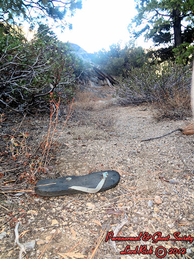 The giant tracks were the gold of our adventure because these tracks were monstrous and in an area that gets very little human activity within this canyon. Jarrod knew immediately what these tracks were after I examined them I came to the conclusion that whatever made them was big. The ground was very frozen yet whatever stepped down had enough way to make not only a deep impressions but a very large one. There were two tracks which sat adjacent from one another by a few feet as if something implanted its left foot with more weight while the right foot wasn't as deep of an impression. The two tracks ended right at some hard rocky ground at the end of this animal path where this giant granite rock of 15' in height by 40' in length blocked its path. I did run a few test I could not duplicate the prints and based on the depth of the prints it was obvious that whatever made them was a minimum of 700lbs at least. The thing that created the tracks stepped down so hard that the caked soil was thrown in ever direction as the massive pressure forced it in every direction. Also nearby the track was someone's flip-flop which I thought was a bit odd. Was this the flip flop of a missing person? Did someone run out of here so fast they left it behind? So many questions not enough answers!