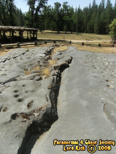 Only 8 miles east of Jackson is a historic state park called Chaw'se Indian Grinding Rock. It is what California is all about simply because of its history and beauty combined. This location just made me love Ca even more after camping in the woods a couple weeks right near where the native Americans lived for so many centuries. Chaw'se is located within the Sierra Nevada foothills and was named after a great outcropping of marbleized limestone slabs with almost 1200 mortar like holes. It is the largest collection of bedrock mortars in North America. The area is nestled in a valley 2,400 feet above sea level with meadows, small creeks and woods. The area has some of the largest Valley Oaks in the state of CA which supplied the Miwok Indians a large supply of acorns. Chaw'se is a Miwok word it means grinding rock. The acorns would be ground and other seeds into meal. They would slowly form a cup shaped depression in the stone as they ground away over the years. Supposedly near these grinding rocks are petroglyphs, circles, spoked wheels, animal, wavy lines and human tracks. I only seen a few but it is true their are foot tracks centuries years old. Some of the carvings in the rocks are said to be as old as 3 thousand years of age. The park was created in 1968 and today its the site of many powwows and campers. I spent at least two weeks living here bathed my son in the stream, did some hiking, roasted marshmallows, got wild in the teepees, toking etc etc lol. It was a spiritual experience. The area has alot of wildlife deer, possum, fox, jackrabbits, bobcats, bats, mountain lions, coyotes, black bear and squirrels. Although some of it I been told by the ranger is very rare. Just across the road is the masonic cave and up the road the town of Volcano which is also on our site just Click Here: Volcano. Further below you can read about the Indian Village and park a little more in depth. As far as paranormal goes Ill leave it at this Bigfoot and Ghost are just a part of what this park is about according to a few locals that I talked with. Also within a short walking distance from the grinding rock is Black Chasm Caverns. Its quite possible the Miwok Natives knew about it might have even stored the deceased near the entrance because it stays cool all year around but nobody knows for sure. The cave system is one of the finest of the west and more then likely its chambers can be found all under Chaw'se. © By Rick-AngelOfThyNight The