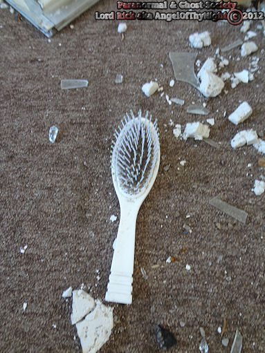 Although, it is not uncommon to find toys in abandoned houses we always have to remain vigilante. To the left of the children's blanket was a mattress it was stained with fecal matter maybe even blood. To the right of the mattress was the kids blanket you see in the photo along with clothing. In the right photo is a children's hair brush just laying a few feet from the blanket. Now this could mean a few things that perhaps someone and their child was squatting in the abandoned cabin. It could mean that these remnants were left behind 15 years ago back when some of the employees lived in these houses at the lodge site. It also could mean the worst case scenario where a child was taken here to be abused. I cannot say for certain what the scenarios are only tell you what I observed. The brush and the blanket seemed allot newer then the other remnants in the house so we have to assume that either they were brought here by someone squatting or a child was brought here for the worst case scenario. As a paranormal investigator we also have to be aware of other finds besides ghost on our investigations such as bodies and crime scenes. Abandoned places attract sometimes some pretty bad people including occurrences. We may not always find the paranormal on an investigation but we do come across this kind of thing regularly. I also filmed the finds and posted them to youtube.
