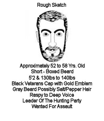 A third hunter approached me after these two would not get me to leave the area this man was very aggressive id say no more then 5'2 to 5'5, middle aged 54 to 56 years of age, short box beard, roughly 130 to 145lbs, short gray to salt n pepper hair and facial hair. He was the leader of the hunting group wore a black hate with a military emblem on it that was gold possibly the Navy. Keep in mind that the Fallon Naval Base is near by and also the Dixie Valley Base. I believe at least three of these men are stationed at either base and have military backgrounds since generally most of the people that spend time at the lake also live on base just 20 miles up highway 50. Below is kind of a sketch of what the man looks like if you were to put a black hat colorize it a little with gray hair it would be very similar to the sketch.