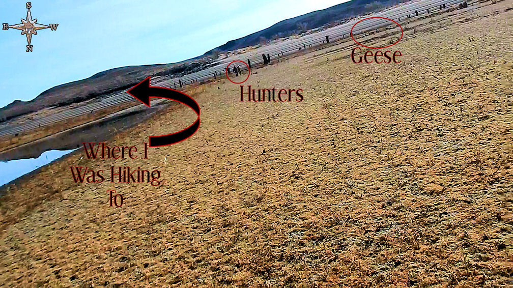 After the incident it appeared that the hunters ran SW towards the beach where there is a road probably where they were parked. Since I told them I was calling the rangers the hunters did split and leave the area.  I had a clip of them running away but since my cam had gotten mud on it is corrupted. What this proves is your not even safe in a state park just as I paid to be here these hunters could have easily went to any of the wetlands in Northern Nevada and would not have to deal with hikers if they chose not to deal with any people. But if your hunting here you have to expect to deal with metal detectors, Williams Station historical buffs and hikers. Not to mention children and families who come out here to explore. Why these men did not hunt elsewhere considering that many of the lakes and hunting areas in Northern Nevada have plenty of geese in a much more remote setting.