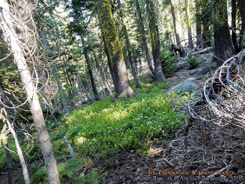 This is a small little clearing not to far from the summit of Devil's Peak. You can see there is foliage growing and white flowers. This area seems to be very lush but its also very hidden and most people would pass it by without ever taking a second glance. However this clearing also holds a very big secret! Do you know what that secret is? My son and I were very far in the distance looking between the trees when we seen the sun peering down onto this patch of foliage. Standing in the middle of it was a very large 10' tall bigfoot like creature bipedal as it stood up and lumbered off. I would speculate that the creature was eating the leaves found on these plants which I have never seen before growing in the sierras. The problem is by the time I put in a new battery to film this creature was gone in less then two to three seconds. I had speculation that perhaps a Bigfoot population resides around the Devils Peak area. Its a rather difficult peak to summit and very remote. It does not even have any set trails so when you venture on it your really going primitive which can be advantageous when trying to locate these creatures in their natural habitat.