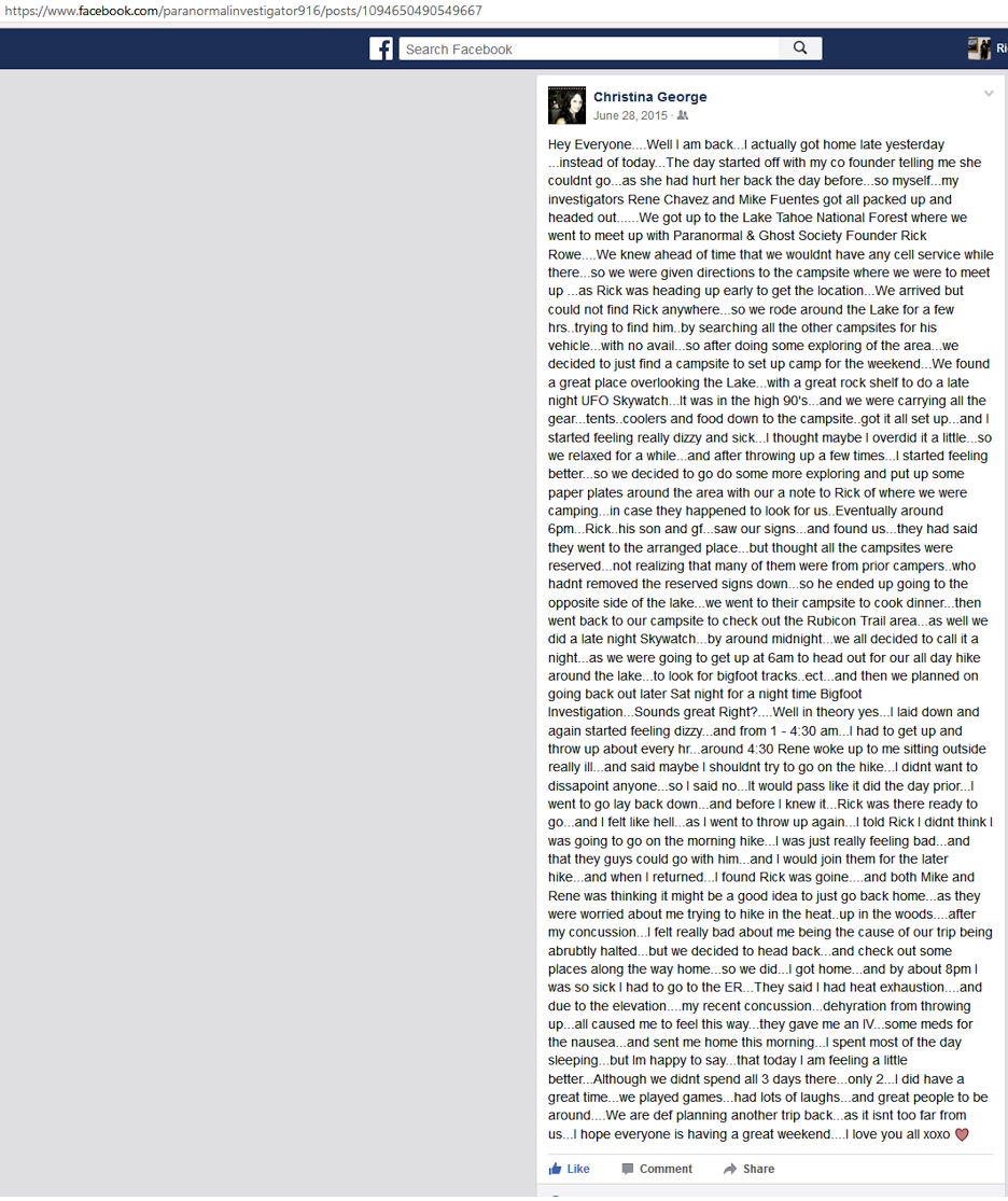 But I do not do drama and I do not appreciate how rudely I was treated by Christina's two investigators. It is not a competition but the least others can do is hear me out and work with me on things. I have not one witness but my son about this bigfoot sighting and other happenings. I could have used more people to take photos, video etc maybe if someone else came with me we would have gotten some video of this creature but I cant do everything on my own. I do not want to hear excuses if you want to work with me you do what you say and say what you mean. I am not here to offend or step on other peoples toes but I deserved a heartfelt apology and why? Because its the right thing to do and that is how you earn someone's respect! No hard feelings just that next time I think if we get together its going to be something smaller like a cemetery that they can handle I just do not think the Crystal Basin or the High Sierras is good for them especially if they are claiming to have elevation sickness which did not seem to be a problem when we were all drinking and smoking some ganja around the campfire our first day so hmmm? But its okay like I said no hard feelings will just plan something smaller perhaps I ovewhelmed them with peaks, lakes, rock climbing etc but afterall isn't that what UFO and Bigfoot chasing is about folks? The thing is that elevation sickness does not effect a previous concussion sustained therefore see a new Dr Christina if that is what they told you because I suffered a concussion on the Rubicon trail smacked my head right onto the rocks because they are smooth and eroded therefore my sneakers heel gave way! I am not even sure how she suffered from Deydration considering her team did not hike and was on the cool lake shore in the woods? Here is the thing if your going to be outdoors in the summer you need to drink water not just beer but water at least a gallon a day! Taking care of yourself is also how you take care of your team and if you are the leader then you do not let yourself get to that point even if you are throwing up you are in charge of the expedition just sayin'! I would know I spend allot of time in the sierras I am a survivalist we carry a gallon of water if not more a piece on all hikes!
