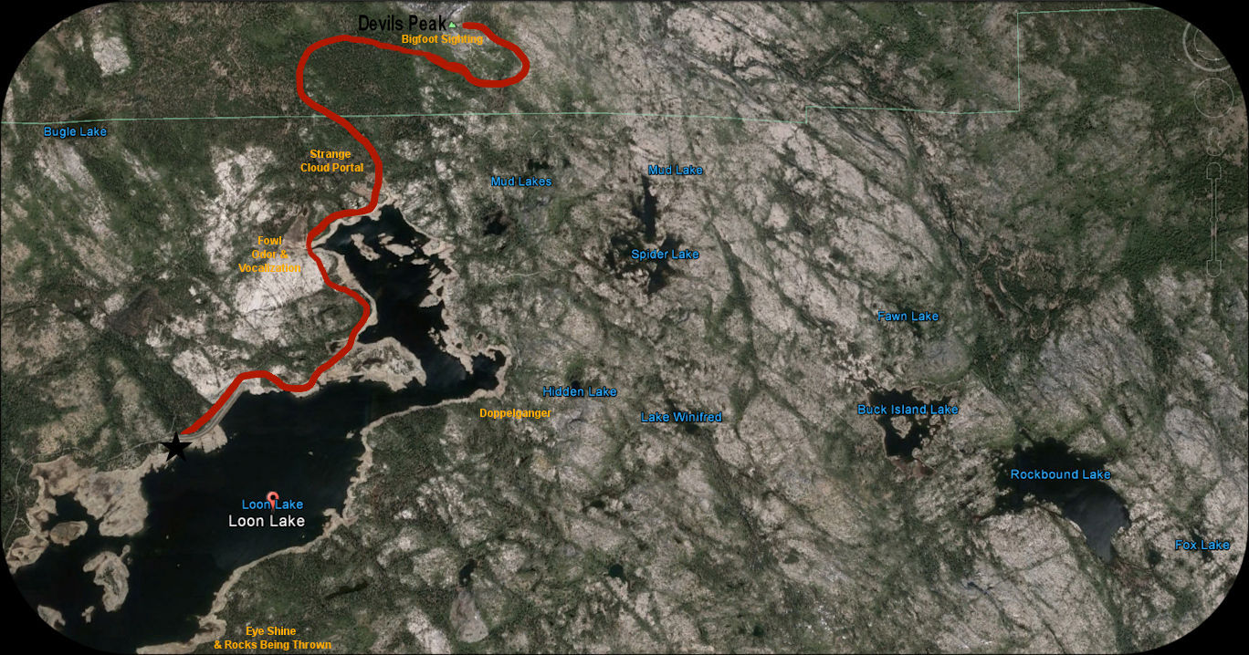 A Map depicting our experiences from our first investigation surrounding Loon Lake & Devils Peak compiled by a three day journey in the area.