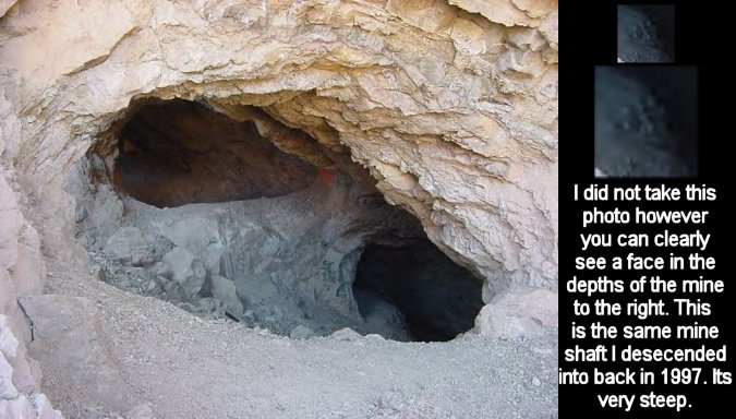 This photo was not taken during the investigation. However I found the photo on the web and analyzed it further finding this oddity. I do not have any ghost photos personally from the investigation since most of the roll I developed was damaged and the few I do have I cannot find right now. But if you look at this mine this is the same one I explored. What you see here is two openings in the shaft. The one to the right becomes a real steep slope going down for about 100 feet then it levels out and there are a few tunnels which lead to deeper areas of the mine. The entrance to the left I believe is a dead end and its not so steep. Its not a nice place I mean you could get lost inside, fall to your death, trip and hit your head, or get attacked by cults hell even demons. The guy I did the investigation with ran once into a man with a knife hiding in the mine.