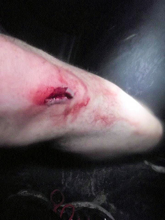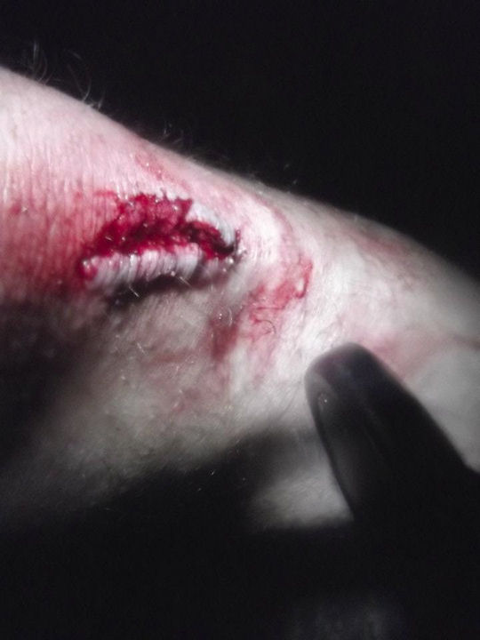 Out of all the cliffs and wet hills I climbed on my expedition surrounding Nelsons Landing this injury was recieved not out of carelessness. Jack Osbourne was sitting in the SUV out of the rain with his high beams on as I walked up El Dorado Canyon. It blinded my eyes so bad that I could not see this pointed sharp slippery rock which I fell onto giving me the following gash. I should have gotten stitches but I did not it took over two months to heal! It was an accident but still its very ironic!