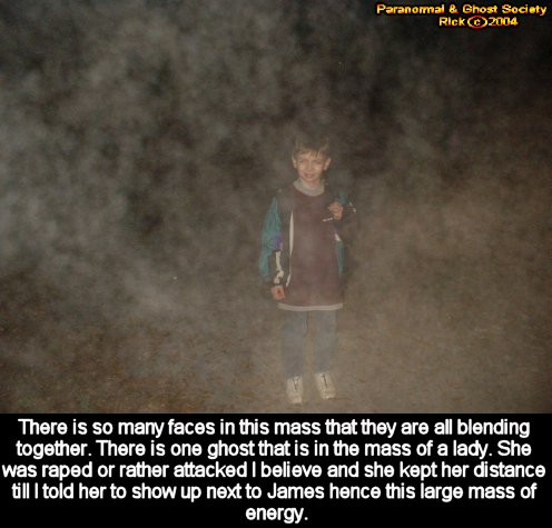 Ecto just vanish. I also noticed that later on James seen a lady literally following us as we walked back to the car. I told him to talk to her and she told him she was raped rather he told me she was hung to death and that she was scared. He said that the lady floated off the ground and she would not approach. But after working a little bit with this entity I was able to get her energy to show around James so she did post with him and you will see the photo of him surrounded as I told her its okay to approach us.