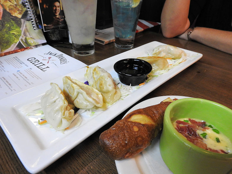The food was great we had these pretzel breadsticks with a tasty cheese sauce, pot stickers and fried up green beans with this nice spicy dressing. We also had a cheesy spinach flat bread and some drinks to go with it. I had a couple long island ice teas with a Terra Massu martini which btw cost 13 dollars not sure why another reason why I gave it four stars because its not a huge martini and they really should charge half that cost. Cheaper drinks means ill be likely to order off the menu more most people agree with me.