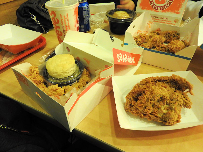 When I arrived at the hotel room we decided to go up to Berkeley and get out of the city of Oakland so we went to Popeye's Chicken on 1775 San Pablo Ave. I honestly in my head thought if we order a meal not only will we save but it would feed all three of us. What kind of 8 piece meal only comes with one breast? We had to order two more then found out no other white meat comes with it.