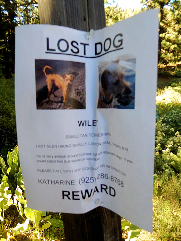 When you enter Squaw Valley behind the rustic hotel is a small overgrown path that takes you into Shirley Canyon. At this point it gets remote real fast almost like a jungle back here with allot of cliffs, rock formations, woods, creeks and pools. At the entrance into the canyon there was a small sign with a poster that said Wiley with a reward and a phone number. I am guessing someone went hiking in the canyon and maybe their dog chased a rabbit or something who knows. I see this allot when I hike in the sierras allot of small missing dogs especially at locations I camp at sometimes. I know this is not evidence of Bigfoot but I had a sighting not to far from the sign on a hill behind it in an overgrown area with allot of brush. I have to speculate that Bigfoot like creatures may possibly prey on smaller dogs especially if food is scarce or the dog becomes a nuisance such as barking like crazy revealing where one of these creatures may hide. Out of the kindness of my own heart I want to help locate these peoples dog I really do! A few years ago I was on a bigfoot expedition up in the Carson Iceberg Wilderness when my dog chased some cattle in the woods. I spent the entire night looking for him hiked through the canyon and he was waiting at my truck. But sometimes a dog ends up getting lost or the owner ends up never finding their fur baby. If you know anything about this Terrier Mix in Squaw Valley please call Katharine at 925-286-8768 our pets are family!