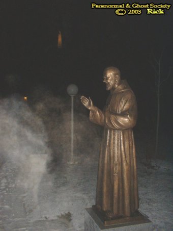 We walked down the road in the center lined with statues then cut across to a park area. The park had some bronze statues including saints from other countries. This area was very cold that was the most out of place thing compared to the rest of the grounds. We captured a few apparitions here and I just admired a few things like the giant stone rocks, benches made of stone and picnic area. We then made our way back out of this section and I thought I seen a figure standing in the distance till a good look at it