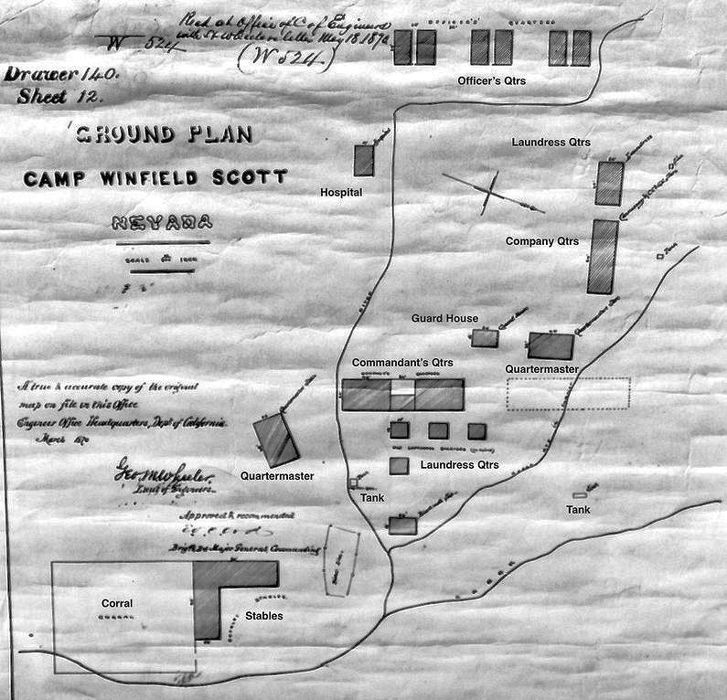 On 19 Feb 1871, 2nd Lieutenant Otto L. Hein, (Cullum 2358), 1st U.S. Cavalry, commanding the detachment at Camp Winfield Scott, departed the camp with all but 6 men left to guard the remaining government property. The camp was closed as of that date.