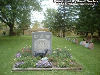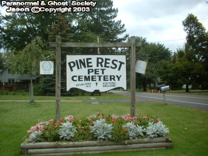 Pine Rest Pet Cemetery was incorporated in 1919 it is one of the very few Pet Cemeteries in the state of NY. There is also some human burials next to there animals. The original cemetery was moved from Tonawanda to here in 1917. This cemetery is very well kept it is a happy place. There is no vandalism here although some stones are worn most are very nice with wreaths, flowers Ect. This place reminds me more of a park rather then a cemetery there is a Gazebo, benches all over, animal statues, pet photographs, and even a creek that runs through the middle of it. As far as it being haunted it is very possible as the cemetery is about 50 to 100 acres with many trees it is very possible that many entities enjoy there afterlife here running around the fields, climbing trees Ect. I kind of let my mind wander here just imagining ghostly kitty cats and Rover running around chasing the cat. It truly is a pretty place not much activity as far as paranormal but we did bring back a few ectoplasm shots to give you an idea of the type of entities that roam here. We wanted to investigate this cemetery because we have done so many human burial areas and this was something different as well as something the public would enjoy. Just about everybody loves animals and usually animal entities are very friendly which really can make a nice investigation. © By Rick-AngelOfThyNight |