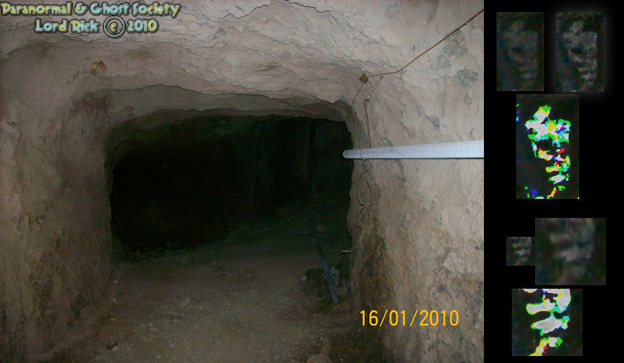 Providence and the Bonanza King Mine . . Rocks...faces....or faces in the rocks? Perhaps this is a blend of the two. . . I am convinced this is the face of an entity. Let me explain to you that this is a photo of a deep hole in the ground. Their are boards placed over this hole however some of the wood has gaps. I was able to somewhat get my lens into the crack thus capturing this anomaly. The face almost looks devilish as its steering up at me. I told Tammy that their was allot of energy around the mine shaft and I felt very cold. I felt what I call "entity" nearby and all sense I felt something beneath the ground where we very stood. The face could be a fluke but one of the benefits of being a field explorer is that you experience feelings that cannot be portrayed with words or photos. To the right is a better photo of this deep hole. Notice towards the bottom of the photo is a wood beam which runs perpendicular to the shaft. This is is very typical of most deep shafts to have wood beams wedged in the walls to prevent the shaft from closing in on itself. How deep this hole goes is uncertain. I did not hear the rock hit the bottom but this was not a part of the Bonanza King Mine but maybe one of the other ones like The Mozart. Although this could also be Bonanza Well I thought the cross beam was odd since wells would not have those. Imagine dipping your bucket of water and getting it caught on a wood beam...then you yank on it collapsing the well ha ha. All humor aside holes are eerie places and more so when you do not know their depths. . . - - - -
