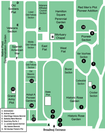 The highest point in this cemetery may also be the highest elevation in Sacramento. During the flood of 1861 the cemetery served as a safe haven from high waters. Hundreds of tents were described as being visible on its hills.