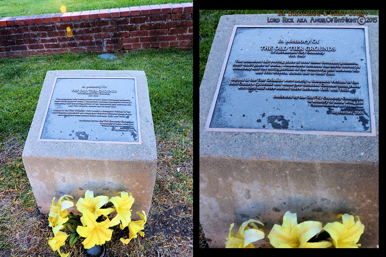 People were very paranoid of also getting sick therefore they begin immediately to bury the deceased in mass graves I read that 600 people were buried in a mass grave in old City Cemetery while the remainder were buried nearby in the New Helvetia Cemetery also in mass graves.  I believe that the Sutter's Fort and New Helvetia Cemetery are the same therefore eventually all the cholera interments would be transferred eventually to Old City Cemetery where in 1852 a monument would be erected. Nobody knows where the mass graves are today but they do exist not to far from the monument. Many folks claim that the haunting's which transpire in Old City Cemetery are actually the ghosts of those pioneers who were buried in mass graves who will never be remembered due to the epidemic panic.