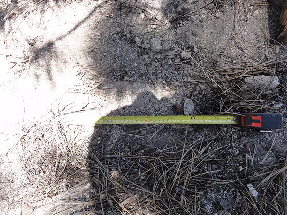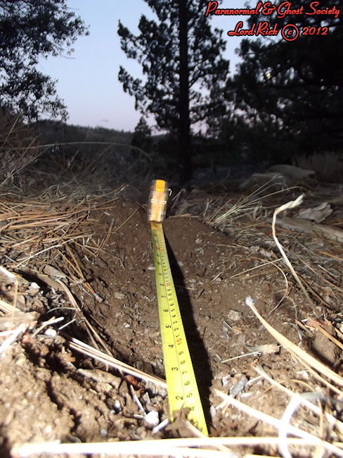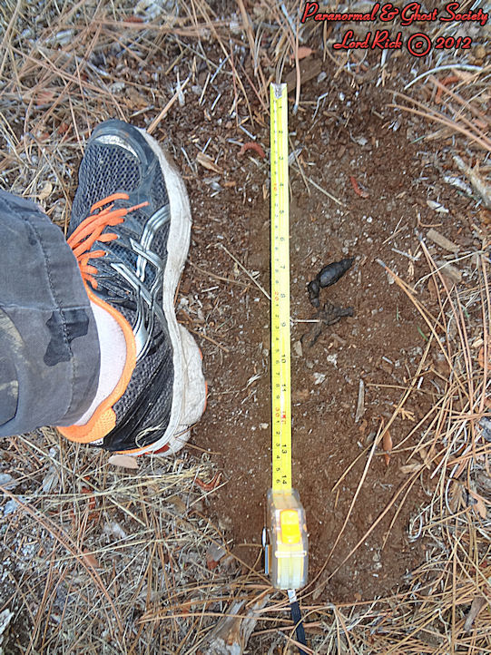 These are depths of two of the tracks found at the track site which vary from 2.5" all the way to as deep as 3.5" which means whatever made them had a significant weight and size. Although the ground is softer at this site its a more secluded area of Red Lake and that is why our team decided to hike here.  The tracks are very unusual we found here as they carry toenail scrapes, depth, width, considerable length and toe impressions. What is even more unusual is a couple of the tracks emerge out of the brush then they head off into the forest going up a slope behind where these were found.