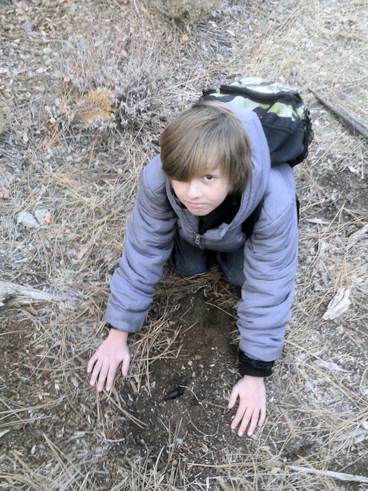 I found this hand print on an area where the dirt is a little bit softer and less rock a mile from Thunder Peak. It is possible that it was made by a Bigfoot like creature since sometimes they run on all fours to gain more territory. Its just an oddity to see as most hikers do not walk on their hands lets face it. You can see my sons track above it as he nearly stepped on it during our hike.
