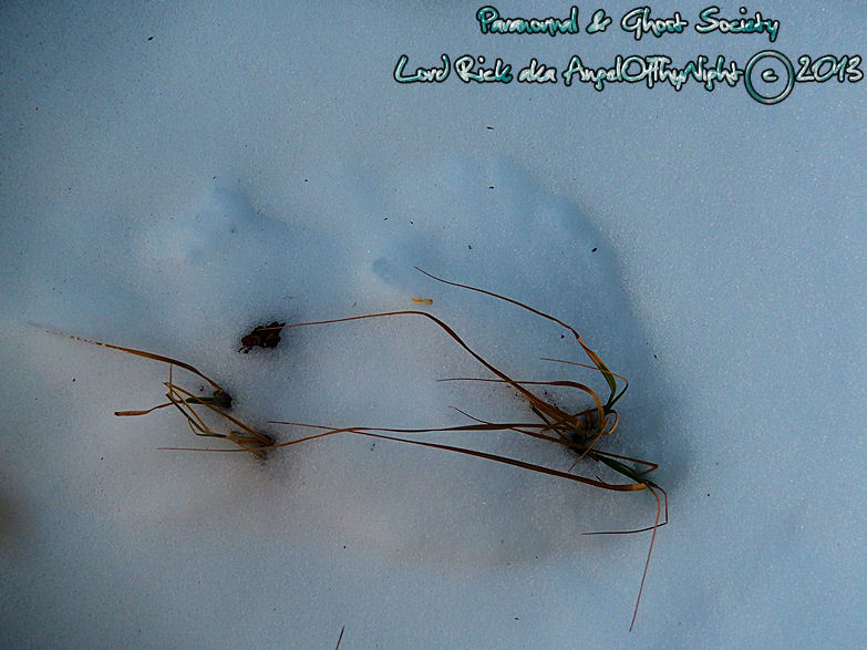 I found this impression on a bank of snow notice how it fans out where the toes are suppose to be. Its also nearly 15" in length and their is a bit of an impression where the big toe touched down.