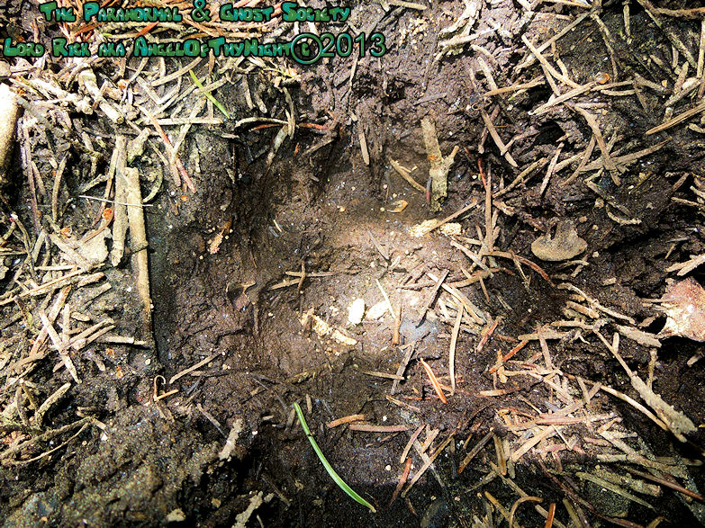 This is a very old track we discovered however one thing is noticeable about it is its very large size. Their are even some toe impressions to the left within the print although they are hardly visible as dirt is starting to consume the track. The heel to the right is not as deep this could be because whatever made it put more weight on its toes as it was found on a slope. I am not saying this is a Bigfoot track but it is quite possible since during our expedition we heard some strange noises and movement a few hundred feet from here.