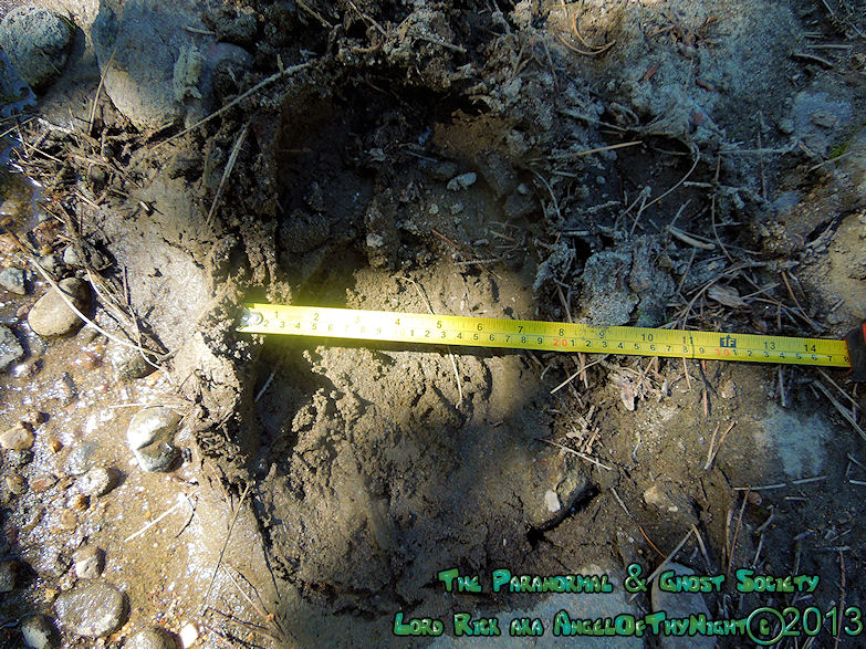 These tracks measure 20" in length so whatever made them was MONSTEROUS! I have used a variety of comparisons to show you different aspects. The photo to the left is a measurement of its length then the photo above to the right shows the strides. Further below is a size comparison of the track as to my foot. My shoe size is a 13 whatever made these would have to be a giant. For further photos of these monster tracks and video see further below!