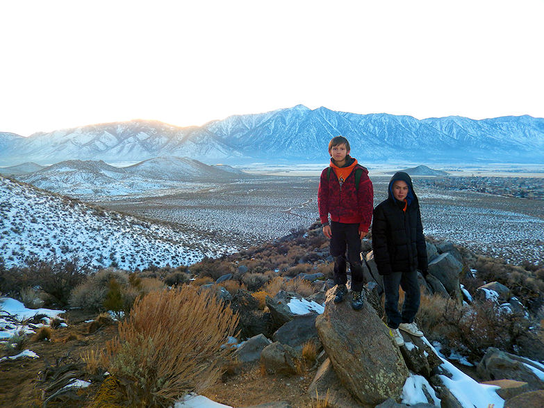 The boys and I also found an area where someone must had camped at for awhile. They had bungee cords, canvas, straps and even part of a flag which was shredded. So it is a given that these hills have seen early explorers, Washoe hunters and outdoor enthusiast on more then one occasion. However in the cooler months people generally stay out of these hills as you can see further below of the snow covered mountains and hillside.