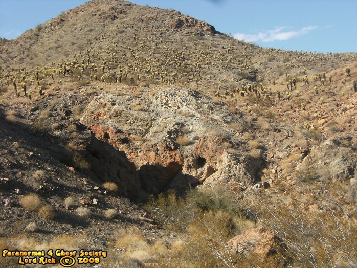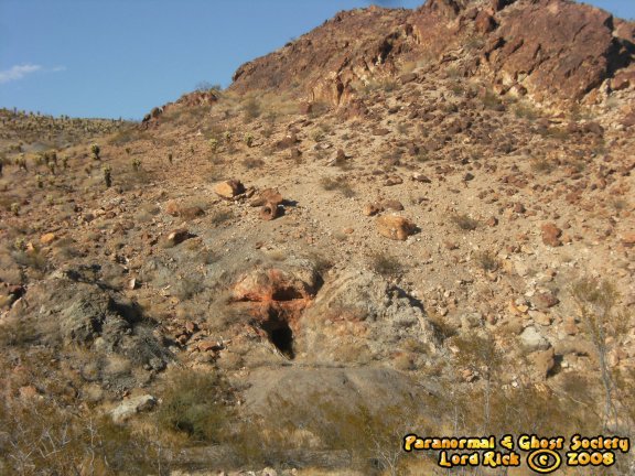 Skull Mine might just be the most eerie place in all of El Dorado Canyon and we first visited it near Halloween of 2008. Basically I was told its part of Jubilee Mine but across the road a ways off in the desert. What is interesting in that the entrance is very natural and shaped like a skull or the boogie man from the movie scream. Its sealed but their appears to be other ways into this mine we have more explorations to do. This place has alot of evil emanating from it much more then even Jubilee. At one time I think it was the other way around but based on the holy bile at the entrance it is a sign that a priest or someone put it there to seal in the demons which roam its dark tunnels. I could feel it almost taste it in the air that something strong was deep in that tunnel staring at me from the darkness. I generally can feel certain qualities about certain places. This entire mine is a mystery to us who knows what occurred here but the history would be very similar to Jubilee since they are both part of the same land grant in the area. © By Lord Rick
