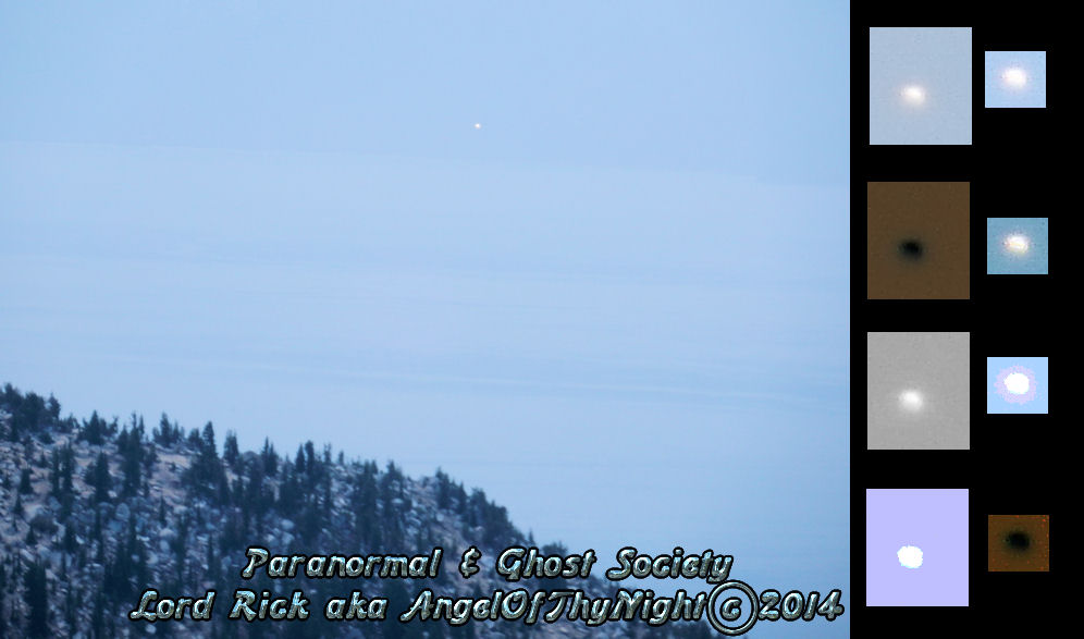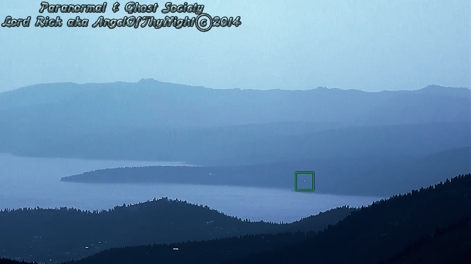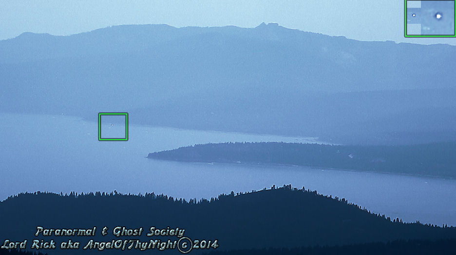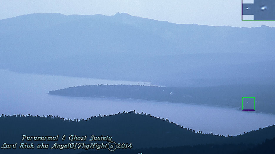 The current object you are witnessesing is hovering over North Lake Tahoe at about a distance of 18 to 20 miles.  One of our investigators told me what appears to be something very bright signaling us such as a mirror. My back was turned on the peak because I was eating my lunch and relaxing from our journey to the top of Slide Mountain. Our investigator was new so at the time he had no idea that this was no mirror in fact if you study this object you will see that its hovering over Lake Tahoe over one of the deepest parts of the lake.